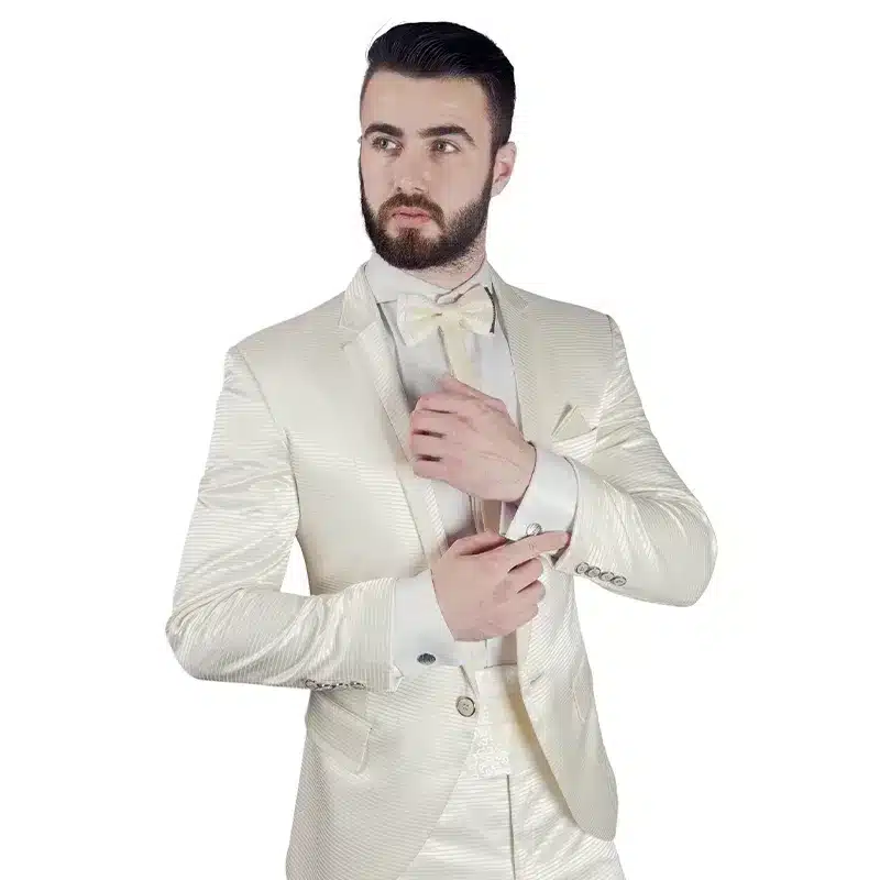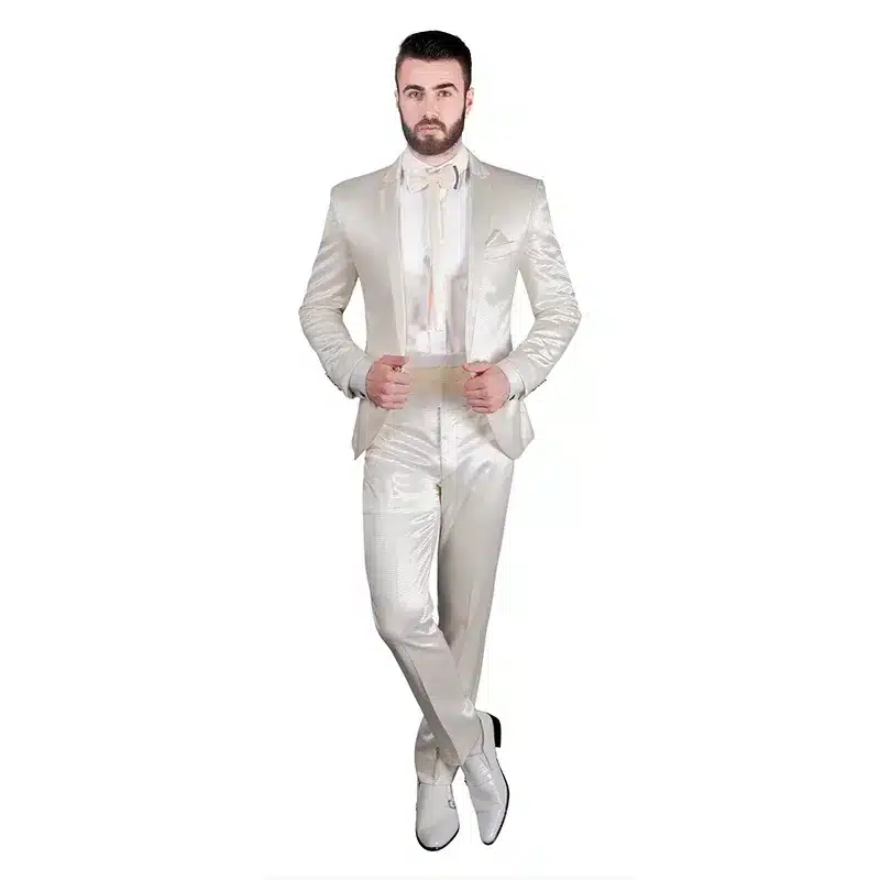 -Saco blanco perla con brillo satinado y solapas de pico. – Pantalón blanco perla de corte slim fit. – Camisa blanca de vestir. – Gemelos [Presentes en el conjunto]. – Fajín ancho blanco perla. – Michí (corbatín) blanco perla. – Pañuelo blanco en el bolsillo del pecho.