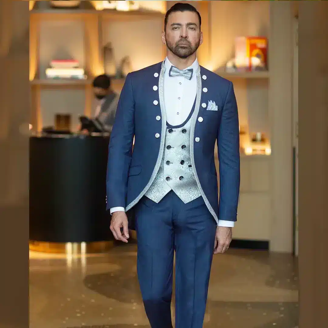 Este traje de 7 piezas en un elegante tono azul italiano es una elección excepcional para novios que desean destacar con un estilo contemporáneo y refinado en su día especial. Perteneciente a la Colección Premium, este conjunto combina un diseño actual con detalles de lujo.