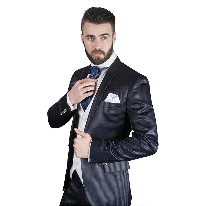 📌 Azul presidente profundo con sutil patrón de rayas finas. 📌 Tejido con una textura elegante que realza el patrón. 📌 Contraste del chaleco blanco. 📌 Ascot azul con patrón texturizado. 📌 Pañuelo blanco con delicado estampado.