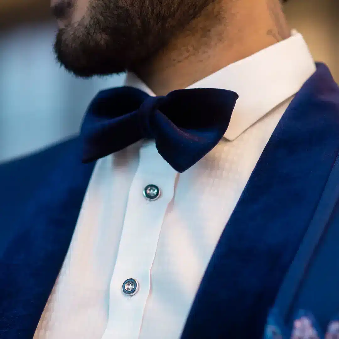 ✅ Michí (corbatín) en velutto, realzando la formalidad del traje.
